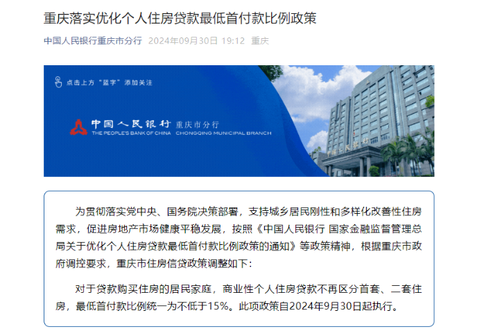 9月30日,央行重庆市分行消息,为贯彻落实党中央、国务院决策部署,支持城乡居民刚性和多样化改善性住房需求,促进房地产市场健康平稳发展,按照《中国人民银行 国家金融监督管理总局关于优化个人住房贷款最低首付款比例政策的通知》等政策精神,根据重庆市政府调控要求,重庆市住房信贷政策调整如下: