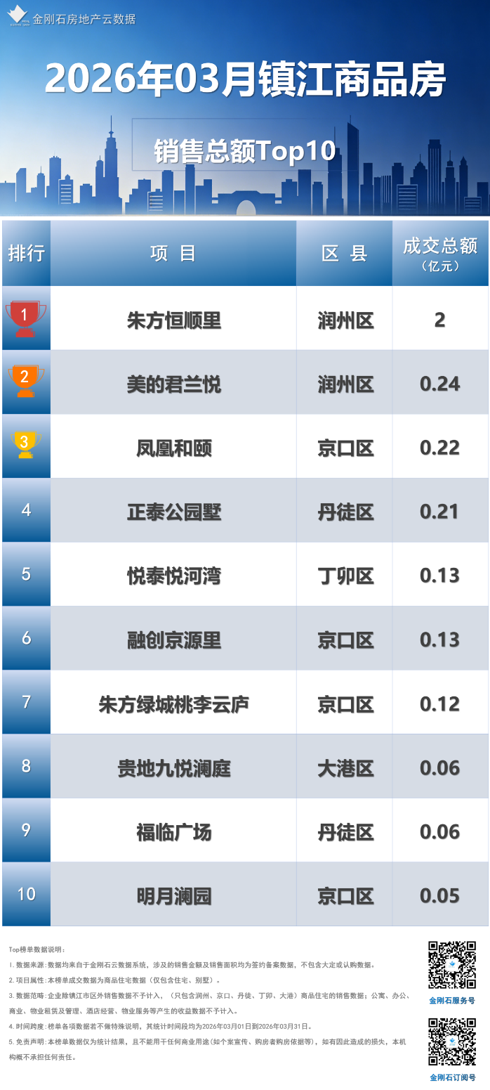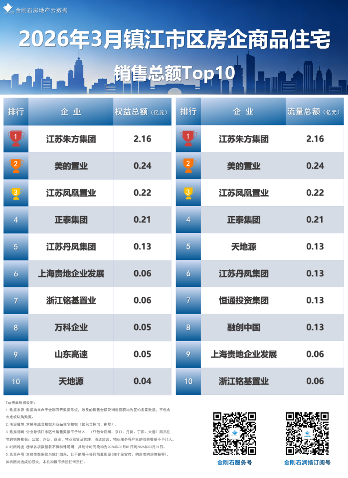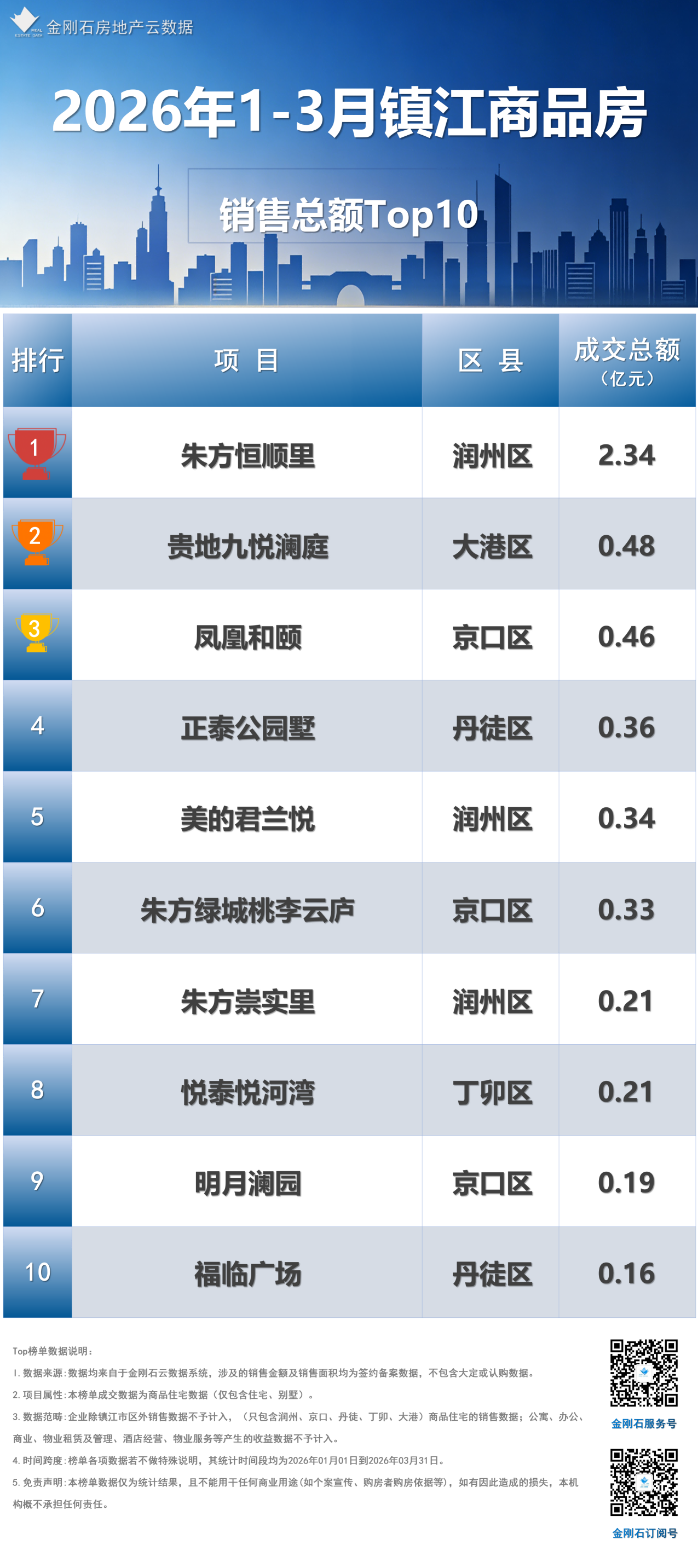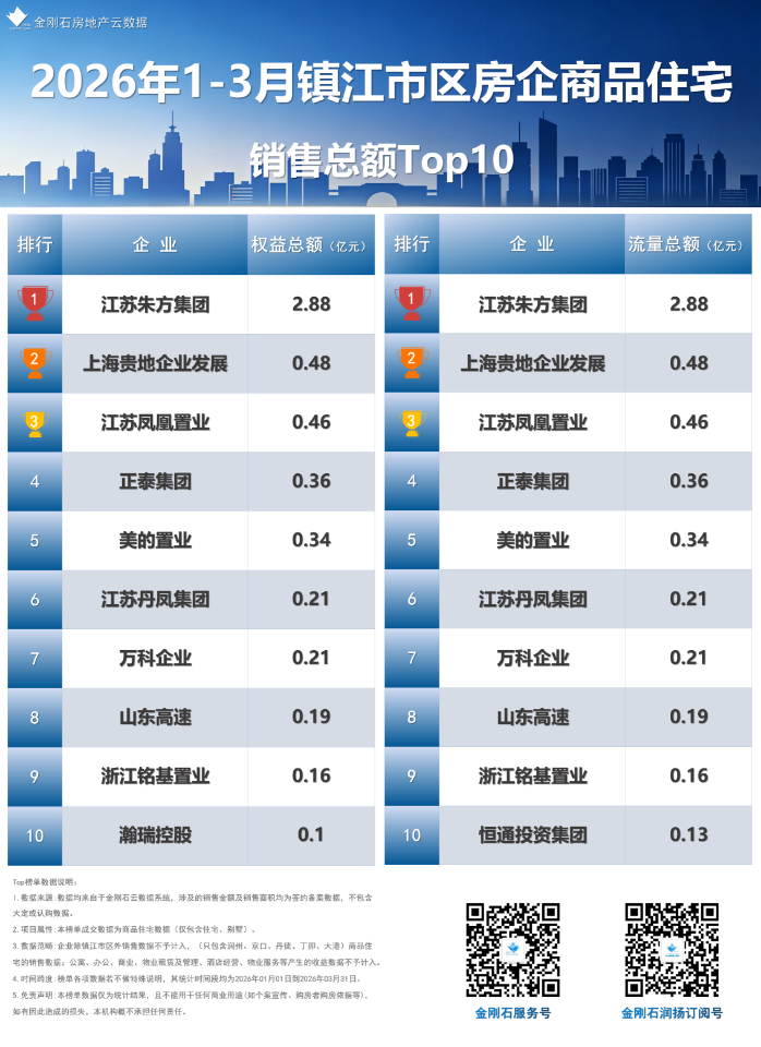 金刚石镇江市2026年1-3月、2026年03月商品房销售数据重磅出炉。