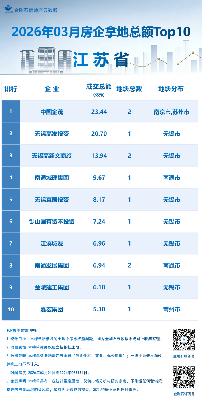 金刚石江苏省2026年1-3月&3月房企拿地金额排行榜重磅出炉。